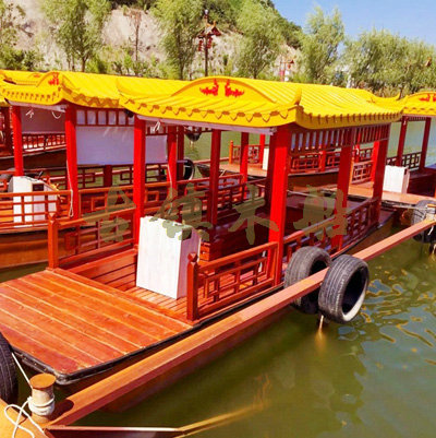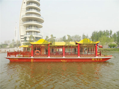 畫(huà)舫船就是裝飾古典華麗的游船,是"中國(guó)風(fēng)"的仿古游船,結(jié)合古典園林建筑,體現(xiàn)了中華文明的古典藝術(shù).畫(huà)舫船豪華而又古典,船上的建筑按照中國(guó)古代建筑里的亭臺(tái)樓閣,建筑工藝之復(fù)雜,要求之嚴(yán)格,仿古畫(huà)舫游船的特點(diǎn)飛檐翹角、玲瓏精致的四角亭子逐漸成形,赫然立于船頭,美人靠、盤(pán)龍柱子、彩畫(huà)……龍柱上的浮雕盤(pán)龍和祥云一層扣著一層,層層錯(cuò)落有致,雕刻精細(xì)到盤(pán)龍身上的每一個(gè)鱗片都細(xì)細(xì)可數(shù),古代皇家標(biāo)志性元素,在畫(huà)舫船上體現(xiàn)的淋漓盡致。除了雕刻、花窗,整條船還有一個(gè)看點(diǎn),那就是弧線優(yōu)美、高高翹起的船尾。游船并不大,長(zhǎng)約10米、寬3米,但是整體看起來(lái)堪稱(chēng)一件藝術(shù)品。船尾的雕花欄桿與船艙、船頭的雕刻遙相呼應(yīng),船身四周貼著浮雕祥云,給整條船增添了富貴、華麗的氣質(zhì)。